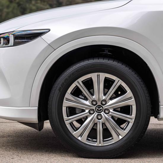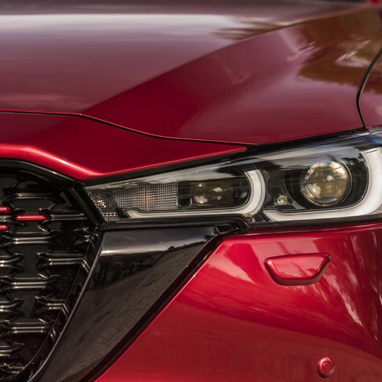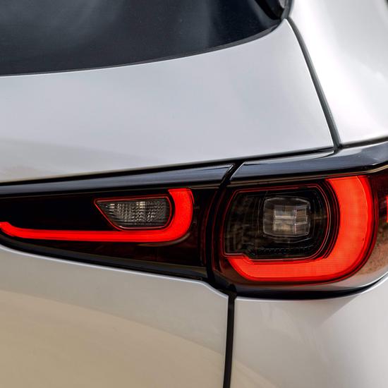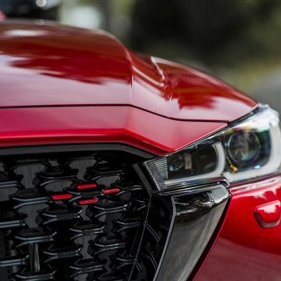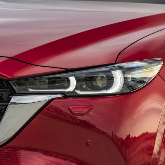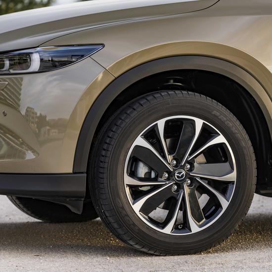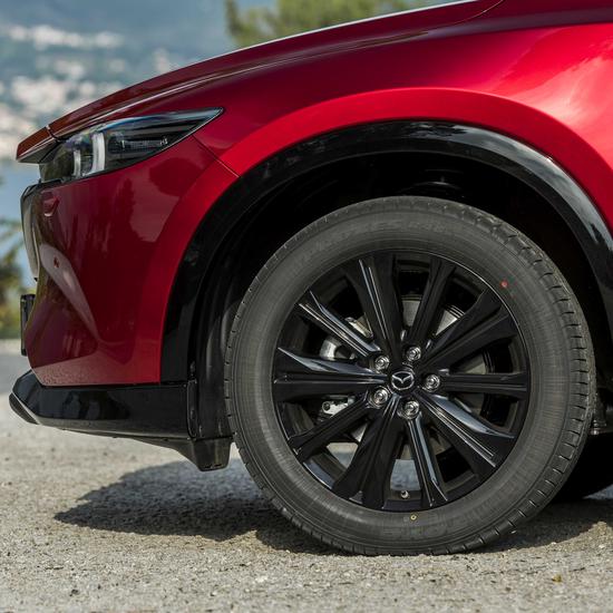 Das sportliche Sondermodell Homura zeichnet sich beim CX-5 2022 durch ein schwarz glänzendes Finish am Kühlergrill, Flügelmotiv, Stoßfänger-Unterteilen, Radläufen, Seitenschwellern und Außenspiegeln aus.