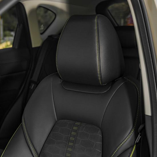 Im Innenraum gibt es Wildlederbezüge mit hellgrünen Nähten und die Akzente an den Lüftungsdüsen sind in dieser Farbe ausgeführt.