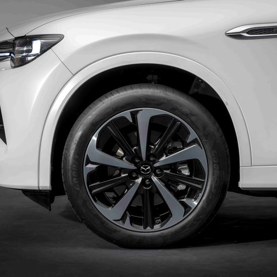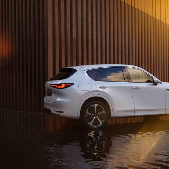 Die eindrucksvolle Statur des Mazda CX-60 vereint die Eleganz des Kodo Designs mit der Robustheit einer markanten Crossover Architektur, mit längs eingebautem Frontmotor und Hinterradantrieb oder Allradantrieb.