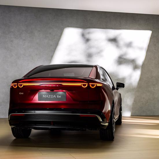 Zu den charakteristischen Designdetails des Mazda6e gehören eine auffällige Lichtsignatur, rahmenlose